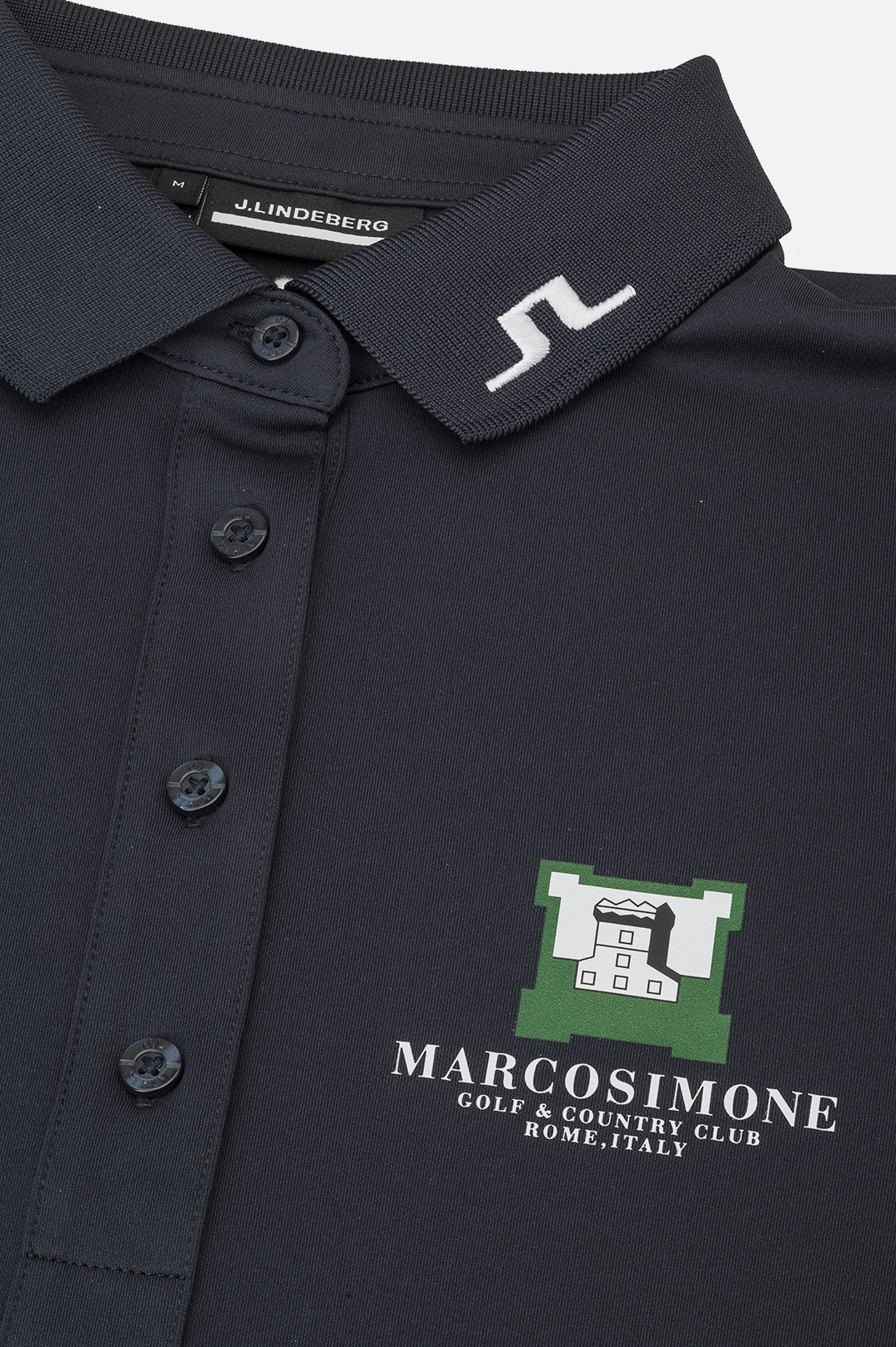 Polo blu con abbottonatura a 4 bottoni, logo stampato Marco Simone Golf & Country Club, realizzata in tessuto sportivo altamente traspirante e perfomante, adatto allo sport. Unisce lo stile essenziale scandinavo alla funzionalità tecnica, perfetta sia in campo che nel tempo libero.